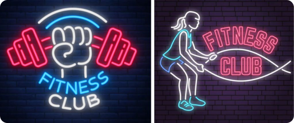Неоновые вывески очень здорово впишутся в интерьер любого фитнес-центра. Можно изобразить мотивирующие надписи, пиктограммы и даже целые рисунки.