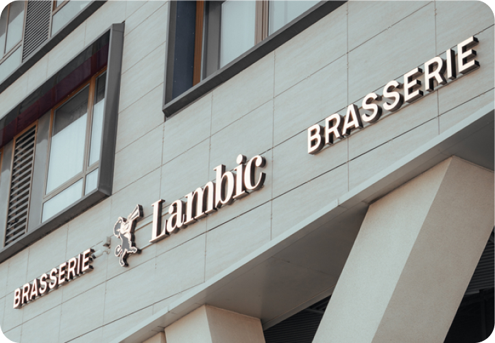 Посмотрите, как красиво смотрится вывеска для ресторана Lambic. Крепёж букв и коммутация скрыты в стене, организована контражурная подсветка.